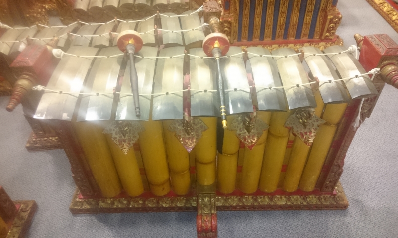 A Gamelan is a large tuned percussion orchestra that originates from Java and Bali, Indonesia made up of large hanging Gongs, giant Xylophones, Drums and other unusually shaped and beautifully ornately decorated instruments. It is traditionally played in the courts and palaces of Java and Bali. Gamelan music is often used to accompany dance and shadow puppet plays based on the traditional Hindu folk tales of the Ramayana and Mahabharata.